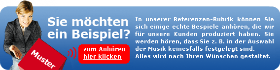 Wir produzieren Ihr Testmuster mit einem Ansagetext, Ihrem Namen, Firmennamen und mit GEMA-freier Musik.